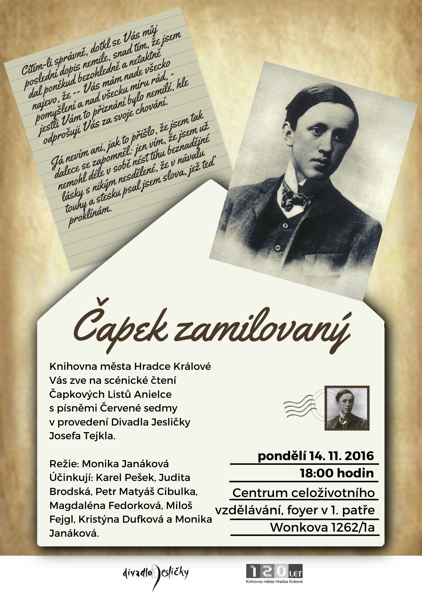 Jsem studentka Univerzity Pardubice, můj dotaz se týká mé bakalářské práce na téma Místa Čapkovské paměti v Hradci Králové. Pořádáte nebo pořádali jste nějaké akce nebo výstavy spojené s Karlem Čapkem a máte nějaké propagační materiály? Moc by mi to při mé práci pomohlo.