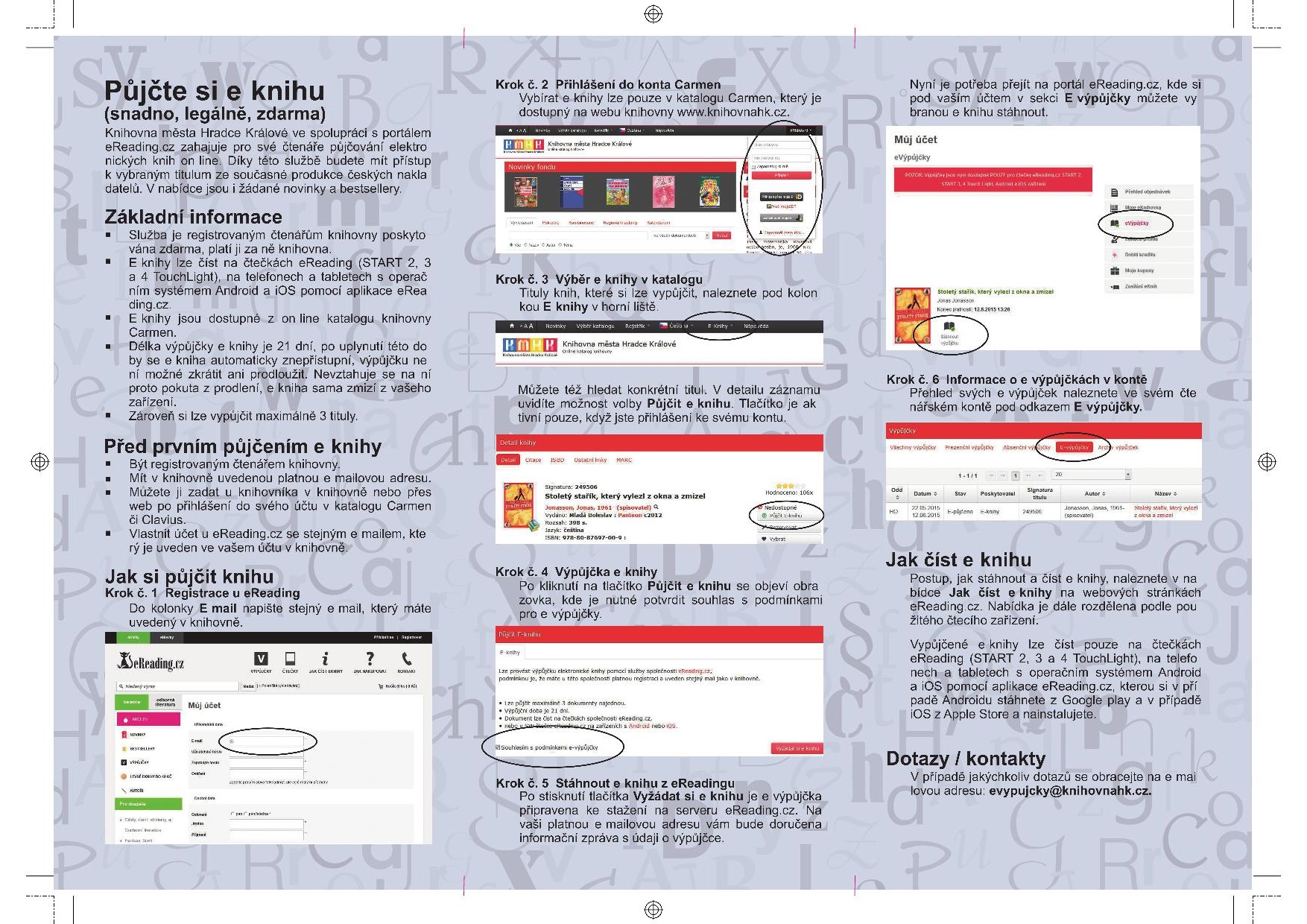 Informace o nové službě: Knihovna města Hradce Králové ve spolupráci s portálem eReading.cz zahajuje půjčování elektronických knih on-line. Díky této službě budete mít přístup k vybraným titulům ze současné produkce českých nakladatelů. V nabídce jsou i žádané bestsellery. Služba je registrovaným čtenářům knihovny poskytována zdarma, platí ji za ně knihovna. E-knihy lze číst na čtečkách eReading (START2, START3), na telefonech a tabletech s operačním systémem Android a iOS pomocí aplikace eReading.cz. E-knihy jsou dostupné z on-line katalogu knihovny Carmen.