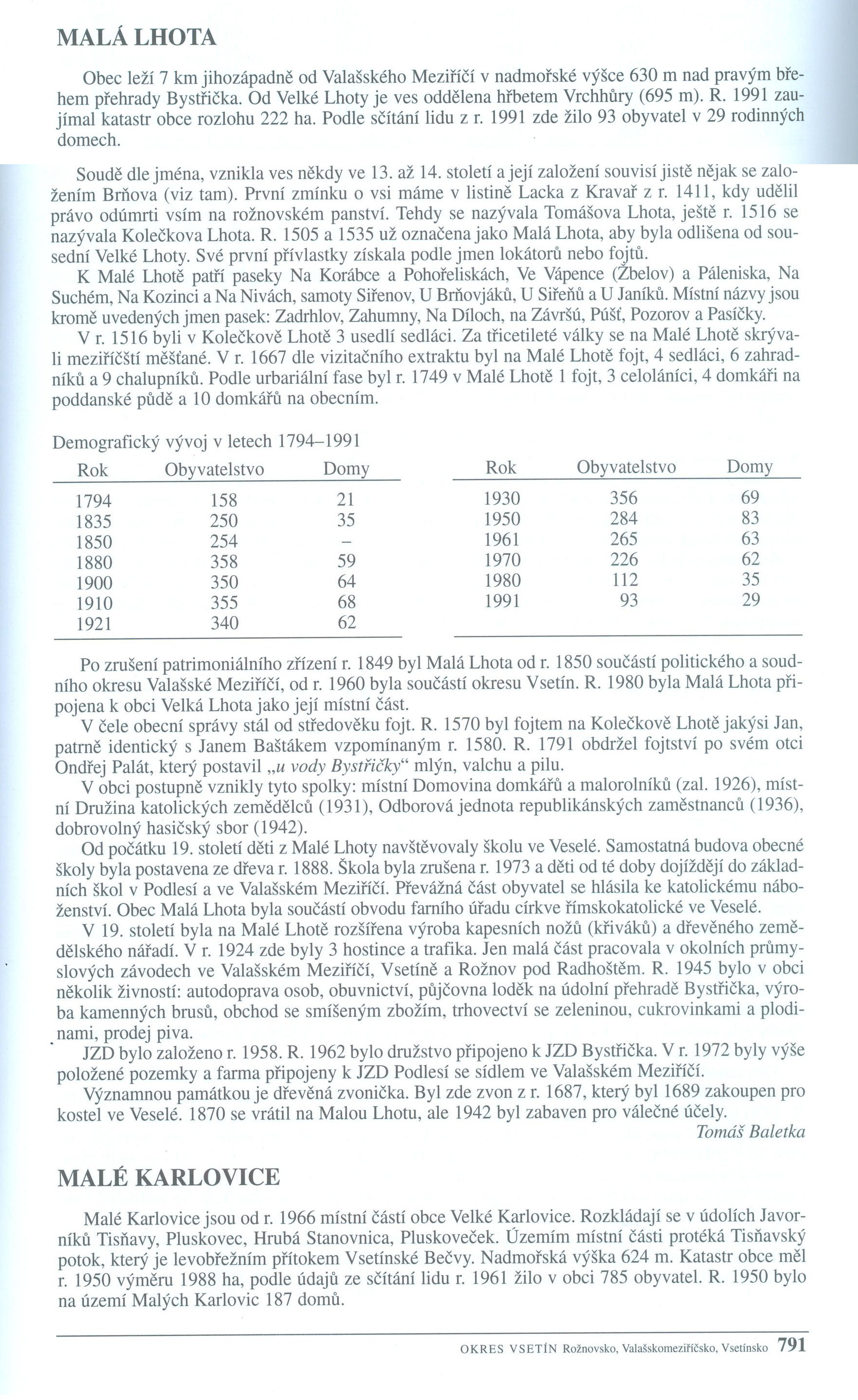 v regionálním oddělení Masarykovy veřejné knihovny Vsetín se bohužel nenacházejí materiály o obci Malá Lhota. Zjistila jsem následující: