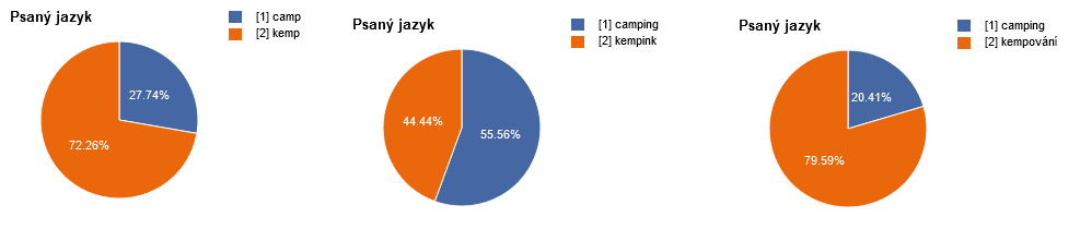 Pro zajímavost pak přikládáme ještě frekvence použití ze dvou korpusových databází. I tam jde vidět, že použití slova kemp je mnohem častější než camp (kde se navíc často jedná o přejatý celý název, např. Camp David nebo Camp Nou). Jedinou výjimku tvoří slovo camping, a to hlavně z toho důvodu, že rozšířenější variantou není kempink, ale odvozenina kempování.