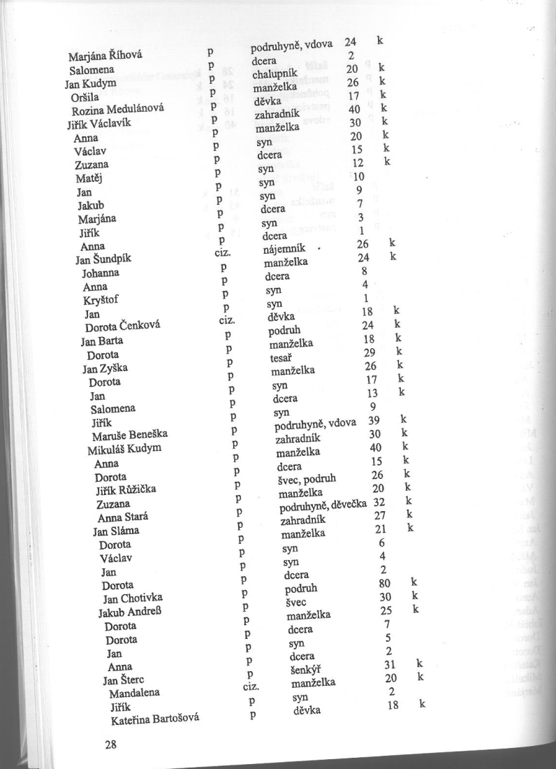 Přikládám naskenovanou stránku ze Soupisu poddaných podle víry z roku 1651 (citace: MATUŠÍKOVÁ, Lenka. Soupis poddaných podle víry z roku 1651: Hradecko - Bydžovsko. Sv. 1. 1. vyd. Praha : Státní ústřední archiv, 2000, s. 28.).