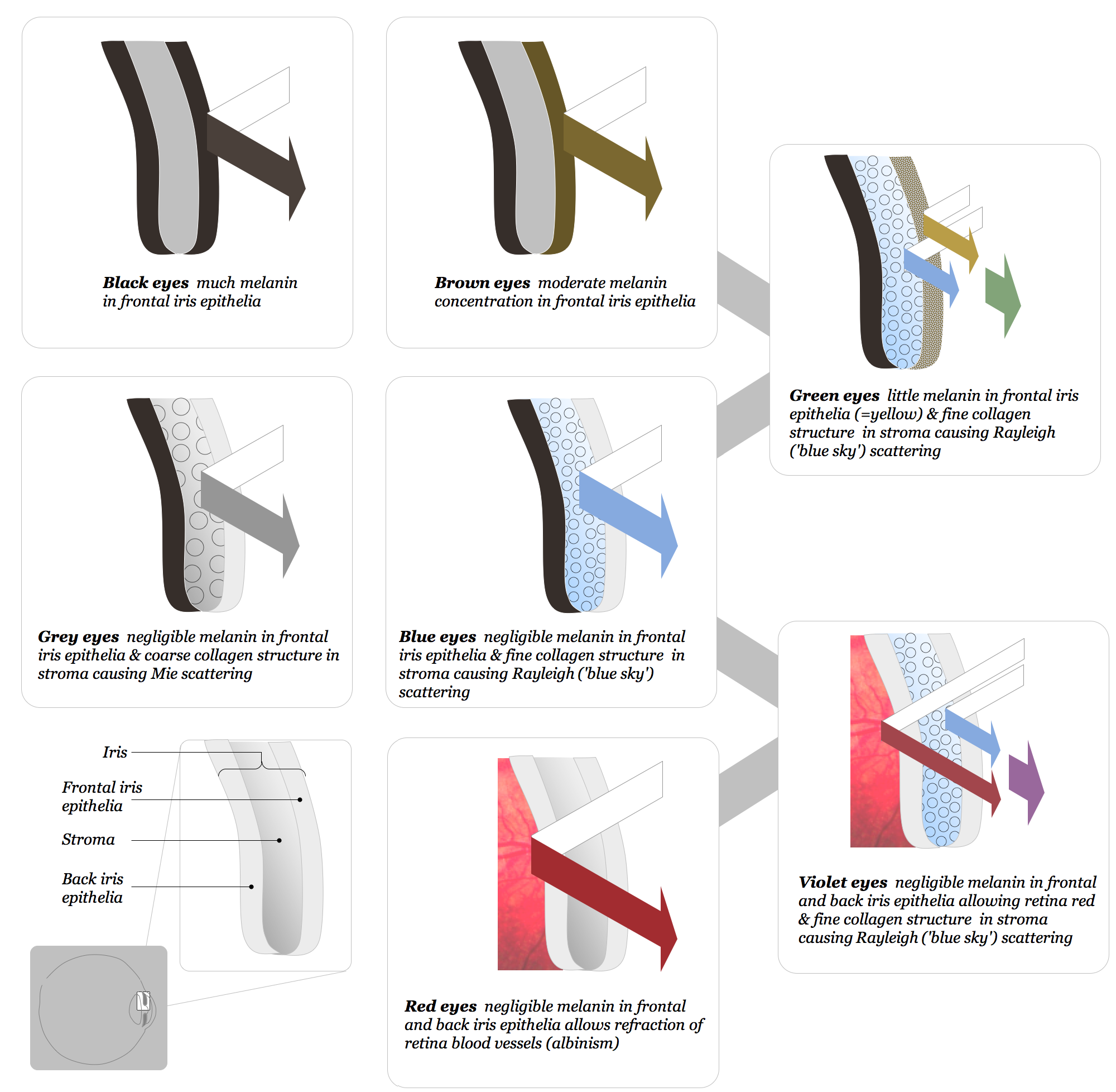 Na skutečné barvě očí se ale podílí kombinace docela velkého množství genů. V principu však všechny geny zbarvení očí kromě hnědé jsou recesivní, resp. na škále recesivity. Uvedu příklad: pokud má jeden z rodičů hnědé oči a obě alely v jeho genotypu jsou dominantní, děti, které bude mít s jakýmkoliv partnerem, s největší pravděpodobností budou mít taky hnědé oči.